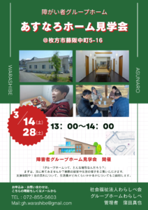 グループホームでの暮らしに興味のある方や、ご家族の方に向けて、下記の日程で見学会を開催いたします。