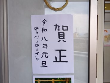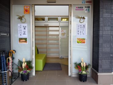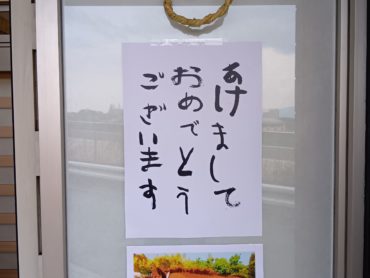 (*玄関に貼っている挨拶文などは、書道で書いた利用者のみんなの字を組み合わせています。又、注連縄・門松は年末にみんなで作りました。)