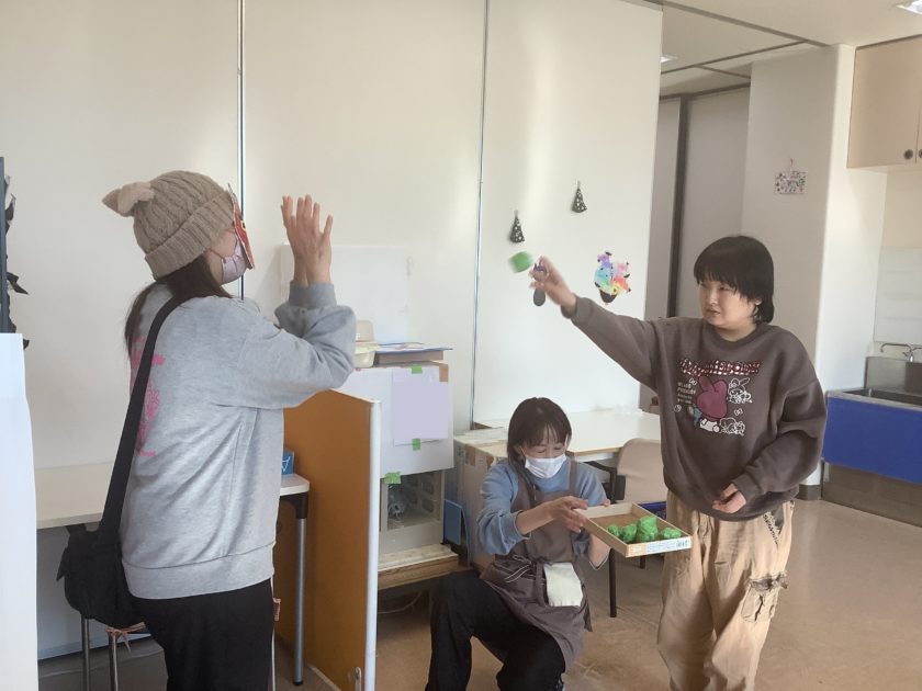 今年は安全面を考慮し、豆まきの代わりに、紙で作ったボールで「ボール投げ」。これで鬼退治を行いました。