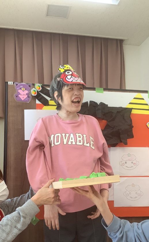 職員が鬼に変身して登場すると、利用者の皆さんからは笑顔や驚きの声があがり、
