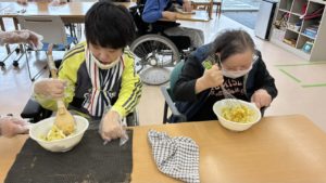 その後は、Haruで収穫した「さつまいも」を使っての「スイートポテト」作りでした。